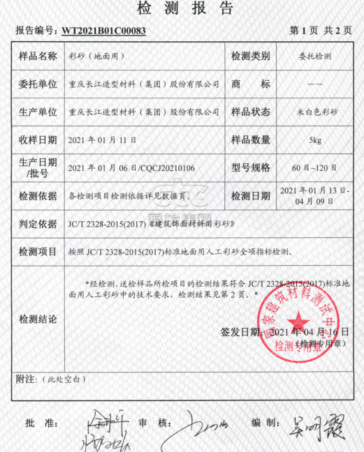 赢博焙烧彩砂已经通过国家建筑材测试中心的权威检测,符合行业标准要求。